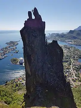 Svolværgeita or Geita (Northern Sami: Spålla) is a 150-metre (490 ft) tall pinnacle at the southwest face of the mountain Fløyfjellet on the island of Austvågøya in the Lofoten archipelago. The 569-metre (1,867 ft) high Fløyfjellet is located on the edge of the town of Svolvær in Vågan Municipality in Nordland county, Norway. The first recorded time a climber reached the summit of Svolværgeita was on 1 August 1910 by Ferdinand Schjelderup, Alf Bonnevie Bryn, and Carl Wilhelm Rubenson.[3][4][5]