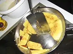 Thin pancakes are cut into slices and are added to a clear broth. As they absorb the broth very quickly, they are added just before serving.