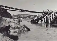 The flood of July 1926 (ARI=30) resulted in the washing away of the Upper Swan Bridge and a section of the Fremantle Railway Bridge.[15] The Fremantle bridge partially collapsed on 22 July 1926, five minutes after a train containing schoolchildren had passed over.[16] No one was injured in the collapse; however, it created major disruption to commerce for several months. Repairs were completed and the bridge reopened on 12 October 1926.[17]