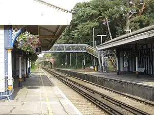 The station is on the stretch of line opened on 6 March 1888 between Brockenhurst and Christchurch to provide a direct line from London to Bournemouth, bypassing the original "Castleman's Corkscrew" line via Ringwood.[1][2] The station had two platforms either side of a double track running line, there was a signal box and several sidings to the south east.[3] A camping coach was positioned here by the Southern Region from 1956 to 1959 then there were two coaches here until 1967, from 1962 to 1967 they were Pullman camping coaches.[4]