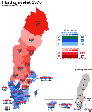 General elections were held in Sweden on 19 September 1976.[1] Although the Swedish Social Democratic Party remained the largest party, winning 152 of the 349 seats in the Riksdag,[2] a coalition government was formed with the Centre Party, the People's Party and the conservative Moderate Party (who won a combined 180 seats), which formed Sweden's first non-socialist government since 1936. Centre Party leader Thorbjörn Fälldin, who had widely been expected to take over the government in the previous election of 1973 (which turned out to bring a 175-175 draw between the left and right blocs), was appointed Prime Minister, the first not from the Swedish Social Democratic Party since Axel Pehrsson-Bramstorp's brief interregnum 40 years earlier.