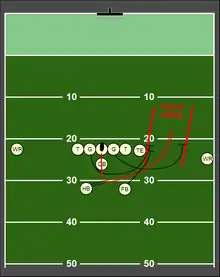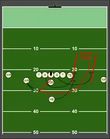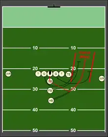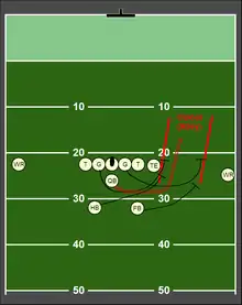 A toss sweep is a play that is usually run out of the I formation or single set back formation. In recent years, it has also been run out of the pistol formation. [1] The quarterback takes the snap, reverses out, then tosses the ball to the tailback. When run from the I formation, it allows the fullback to pick up any defenders who have penetrated into the backfield. Blocking from the offensive line ranges from straight zone blocking to pulling the playside guard. While this sweep doesn't have as many playfake combinations as the buck sweep, it tends to be more powerful and allows the running back to turn upfield faster.