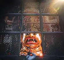 Inside the wooden latticed screen, below Dega Taleju is hidden the terrifying face of Swet Bhairav. The giant sculpture was fashioned and installed in 1795, during the rule of Rana Bahadur Shah