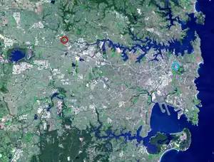 Satellite map of Sydney showing locations of Wanderers' Bankwest Stadium (Red) and Sydney's Sydney Football Stadium (Blue)