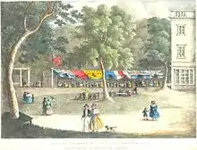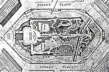 After the redevelopment and renaming of Vauxhall Gardens in London in the 1780s, pleasure gardens were opened in many cities in the United Kingdom and later elsewhere in the world. These often incorporated Vauxhall into their titles as with the Bath Vauxhall Gardens.[5] The gardens were constructed in the 1790s, opening in 1795 as a commercial pleasure grounds, following the development of Bathwick by Sir William Pulteney, 5th Baronet, across the River Avon from the city centre.[6] It was funded by selling £100 shares.[7] The original plans were by Thomas Baldwin and completed by Charles Harcourt Masters who included labyrinth,[8] grotto, sham castle and an artificial rural scene with moving figures powered by a clockwork mechanism.[4] The gardens were illuminated by over 15,000 "variegated lamps".[9]