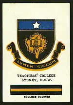 Cigarette card featuring the Sydney Teachers' College's crest and colours, circa 1920s