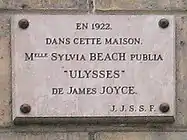 Plaque at 12 Rue de l'Odéon, Paris VI, location of Shakespeare and Company, which reads "In 1922, at this location, Mlle. Sylvia Beach published Ulysses by James Joyce."