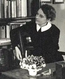 While conducting research at the Bibliothèque Nationale, in a French literary journal Beach read of a lending library and bookshop, La Maison des Amis des Livres[3] at 7 rue de l'Odéon, Paris VI.[4] There she was welcomed by the owner who, to her surprise, was a plump fair-haired young woman, Adrienne Monnier. Monnier was wearing a garment that looked like a cross between a peasant's dress and a nun's habit, "with a long full skirt … and a sort of tight-fitting velvet waistcoat over a white silk blouse. She was in gray and white like her bookshop."[4] Although Beach was dressed in a Spanish cloak and hat, Monnier said later she knew immediately that Beach was American. At that first meeting, Monnier declared, "I like America very much".[4] Beach replied that she liked France very much. They later became lovers and lived together for 36 years[5] until Monnier's suicide in 1955.