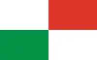 The civil flag was a rectangle divided in the middle into four equal rectangles. The top left and bottom right fields were white (silver), while top right field was red, and bottom left, was green. The state flag additionally featured the coat of arms of the county placed in the middle.[2][7]