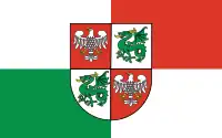 The flag is a rectangle divided in the middle into four equal rectangles, that that alternate between red and white (silver) fields. The top left and bottom right fields are red, while, the top right, and bottom left, white (silver). The red fields feature a white (silver) eagle with yellow (golden) beak, legs, stripes on its wings, and a ring on its tail. The white fields feature Piast Dragon, a green dragon with red tongue, and legs.[1]