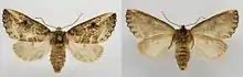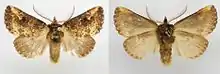 The length of the forewings is 17.2–19.21 mm for males and 20.22–21.51 mm for females. The ground colour of the forewings of the males is dark brown, with a reniform black spot and a light brown basal band. The hindwings are dark brown. The forewings of the females are also dark brown with a beige antemedial band, lined on both sides by sinuous dark brown lines and with an irregular white thin bar from the apex to the black reniform spot. The hindwings are dirty beige with a light brown postmedial line and black discal spot.