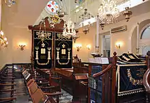 The entrance to the original building was on Synagogue Lane, now Serfaty's Passage. Following its destruction in the storm of 30 December 1766, a larger synagogue was rebuilt at the same site in 1768, but with an entrance on Engineer Lane. The second building was also destroyed during attacks by the Spanish on 17 May 1781. A third building was constructed after the conclusion of the Great Siege of Gibraltar. In 1812, that version of the synagogue was damaged by fire and had to be partially rebuilt. The current vaulted ceiling of the synagogue dates from that 1812 renovation.[3][4] The synagogue at 47/49 Engineer Lane has colourful tiles, marble floors, wrought iron spindles, and wooden furniture.[2] The Great Synagogue not only remains active; it is still Gibraltar's principal synagogue.[4][12]