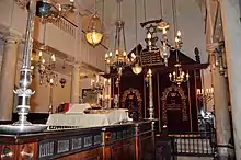 The interior of the building was destroyed by fire in 1913. The architect who was responsible for its reconstruction was an Italian who was more familiar with the architecture of Catholic churches.[3] As a result, the Flemish Synagogue now has a beige, Dutch exterior and an Italian interior, with marble, and a reading desk incorporated into the ark for the Torah, instead of it's original position in the centre of the building. The interior design was originally modelled after the Amsterdam Esnoga. After 1945, Moroccan tiles were installed in the interior of the synagogue, which has ornately patterned ceilings and walls.[2][3] The only remnant of the original garden was a single palm tree in the synagogue's courtyard, which was removed in 2023.[3] The Flemish Synagogue, which remains an active place of worship, is located at 65 Line Wall Road.[4][14]