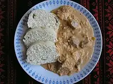 It is typically served with slices of a bread-like dumpling, accompanied by a light, spicy red wine (such as kadarka), cold sour cream, and chili pepper cream.