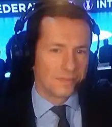 After Roland's departure, Jeanpierre hosted the show in 2004, alongside Nathalie Renoux.[9] In January 2005, they were replaced by Thierry Gilardi, who presented the show until his death in 2008.[8] After his death, Téléfoot gave a special tribute to him, including interviews with Didier Drogba and Jacques Vendroux.[10] Christian Jeanpierre took over from Gilardi as Téléfoot presenter,[11] and his first programme was the one dedicated to Gilardi.[7] Co-presenters alongside Jeanpierre included Frédéric Calenge and Charlotte Namura, and Bixente Lizarazu made guest host appearances on the show.[7] After the 2018 FIFA World Cup, Jeanpierre was replaced by Grégoire Margotton as the main presenter of Téléfoot.[12][13]