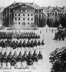 The barracks were occupied by the Royal Bavarian Infantry Lifeguards Regiment until 1918, and then by the 2nd "Kronprinz" Line Infantry Regiment. From the 1890s onwards two other regiments were billeted in the new barracks. Another wing was added in 1872–73, followed by an "Exerzierhaus" or gymnasium in 1886. On the 1918 Revolution soldiers closed down the barracks under orders from Kurt Eisner.