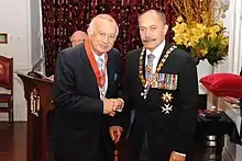 Tūroa Royal CNZM (left), after receiving the insignia of the Companion of the New Zealand Order of Merit from Governor General Sir Jerry Matepārae in 2013.