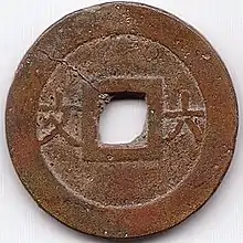 Tự Đức Thông Bảo (chữ Hán: 嗣德通寶) was an inscription used on different coins made from various metals and alloys during the reign of Emperor Tự Đức.[8] The coinage of Tự Đức saw the introduction of the term văn (文) which was an accounting unit used for copper-alloy cash coins denominating their worth in number of zinc cash coins with a weight of 6 phần.[9][10]