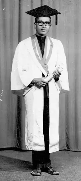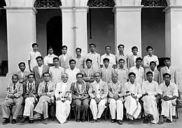 Sastry had his primary schooling at Kanakapura near Bangalore. He finished his Intermediate course in 1947–48 and from 1948 until 1954, he pursued undergraduate and post-graduate degrees at University of Mysore, where he enrolled initially in Yuvaraja College and came under the influence of Kannada professors N. Anantarangachar and U. K. Subbarayachar. In 1950, he joined the B. A. (Honours) course in Kannada at Maharaja College.[2] Among his teaching faculty were renowned scholars like K. V. Puttappa (Kuvempu) who taught "Pampa Bharata" and "Literary Criticism", D. L. Narasimhachar (History of Literature), S. Srikanta Sastri (Cultural History of Karnataka)(see group photograph), K. V. Raghavachar (Kannada classic – "Basavarajadevara Ragale"), N. Anantarangachar (Kannada Grammar – "Shabdamanidarpana"), T. S. Shamarao (Vachanas of Basavanna) and Parameshwar Bhatt (Bharatesha Vaibhava). He worked on Pampa, Ranna, Harihara, Nemichandra, Raghavanka and Kumaravyasa utilizing ancient texts both from Mysore University library and the Oriental Research Institute, Mysore. He completed his Master of Arts (Kannada) degree from Maharaja College, Mysore in 1953–54 under the guidance of D. L. Narasimhachar.