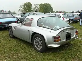 In mid-1969, to provide a car at an intermediate level of performance, TVR released the Tuscan V6.[4] Equipped with a 2994 cc OHV Ford Essex V6 motor, which came from Ford's British division (also used in the Ford Zodiac Mk IV and Ford Capri). The brakes were changed from the V8 model, as only the front used discs, and the rear had drum brakes.[5] The V6 model was also narrower, using the same bodyshell as the TVR Vixen but with provision of an access panel above the rear differential, and a round tubular frame chassis similar to the TVR Vixen but with some upgrades. It did, however, receive the same Salisbury differential as the Tuscan V8.[4] The 3.0 L V6 powerplant produced 138 hp, and 182 lb/ft of torque equipped with a twin choke synchronous Weber 40DFAV carburetor and the car was able to reach speeds of 125 mph. At the time it was offered for sale, the Essex V6 did not meet emissions requirements in the United States, so the Tuscan V6 was not exported there although at least one car was sent into the US masquerading as a TVR Vixen.[3] Most of the cars produced were right-hand-drive, for the home market.[6] There were a total of 101 V6 cars produced including a prototype before the line was stopped altogether to make way for its successor, the TVR Vixen 2500.
