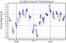 TV Geminorum is classified as a semi-regular variable star, meaning that its brightness changes are not predictable, but do show some periodicity. The General Catalogue of Variable Stars does not list a period,[3] but the International Variable Star Index gives an uncertain period of 229 days.[2] A detailed study of TV Gem between 1997 and 2014 detects periods of 411 days and 3,137 days.[7]