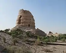 At the center of the site lies the foundation of a large temple building, north of which is the main pagoda standing 14.5 metres (48 ft) tall. The adobe structure is covered by white lime and is of the shape of an overturned bowl. North of the main pagoda are the remains of 11 smaller ones.[1][2] Most of the extant ruins date from the Western Xia dynasty, including all of the pagodas.[1][2]
