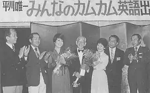 For five years from February 1946, Hirakawa was in charge of the 15-minute "English Conversation" program on NHK's First Broadcasting System at 6 p.m. He wrote the theme song Come, Come, Everybody, which became a national favorite song.[11] After retiring from NHK as "English Conversation" instructor, Hirakawa continued his "Come Come English" at the other broadcast stations: Radio Tokyo (now TBS Radio) and Nippon Cultural Broadcasting (文化放送).[12] At the end of 1957, he was welcomed by Pacific Television (ja:太平洋テレビジョン), where he became the head of the translation department and then Vice President of the station.[6]:p. 216 – 217