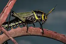 Taeniopoda eques, the western horse lubber grasshopper, is a relatively large grasshopper species of the family Romaleidae found in arid and semi-arid parts of southwestern United States to central and southwestern Mexico.[1][2] Most populations are identifiable by their shiny black bodies with contrasting yellow markings, but some adults (frequent in parts of Mexico, rare in the United States) are mostly yellowish, orangish or greenish. The species is unique in using its black coloration to thermoregulate and in being chemically defended. The aposematic coloration warns vertebrate predators of its unpalatability and allows the grasshopper to roost conspicuously upon shrubs.[3][4]