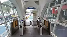 The system was entirely composed of articulated buses. Unlike conventional buses, the fare was to be paid at the stations, not on the bus. The stations featured ticket gates at the entrance of the station, as well as automatic platform gates that would open and close simultaneously with bus doors. Signal priority was to be given to the buses to save travel time.