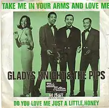 Originally released in the US on the Soul label in 1967 with "Do You Love Me Just a Little, Honey" as the B-side,[1] the song only charted at number 98 on the Hot 100.[3] "Take Me in Your Arms and Love Me", however, did not chart on the national, Billboard's Top Selling R&B Singles chart. Overseas, it was later released in the UK in 1967 on the Tamla Motown label. It made number 13 in the UK charts in June 1967 and was Gladys Knight & the Pips' first UK hit.[4]