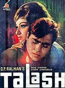 Talash is a 1969 Hindi drama film directed by O. P. Ralhan starring Rajendra Kumar and Sharmila Tagore in lead roles.[2][3] This was the first Indian movie which was publicised as having a budget of Rs 1 Crore (i.e. INR 10 Millions).