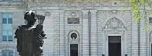 The statue is positioned on a base of Vermont marble and measures 96 by 59 by 46 inches (2.4 m × 1.5 m × 1.2 m). The area between the figurehead and Bancroft Hall is called T-Court.[5] In 1930, the wooden "heart" and "brains" of the original statue were transferred to the bronze statue.[1]