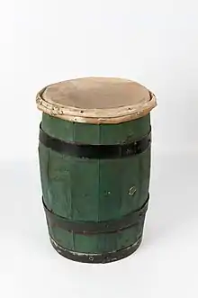 An essential element of the Tambú is the single drum which is played during a performance, called the tambú or bari (translated to barrel).[11] The original instrument in Tambú's early years was made out of a hollow tree trunk, its opening covered with animal skin.[11] During the early 17th century the drum took different forms of shapes, in conjunction with the restrictions.[11] As the performance became more secretive in different locations, lighter smaller drums were used, as well as household items such as tables and chairs.[11] Another alternative drum used was known as the kalbas den tobo (“calabash in a tub”), which was made using wooden wash tubs filled with water and a large calabash floating on top.[11] This produced a muffled, quiet sound that allowed Tambú to be performed indistinctly.[11] New types of drums continued to appear in Curaçao. Due to the negative environmental implications of Dutch settlement, trees became less populated on the island.[11] The main type of bari was made from the wood of old vegetable boxes, melded into a cylinder, with sheep skin stretched over the top.[11] This technique is used to construct the drum in modern Curaçao society.