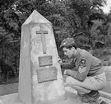 Soldier of the 2nd Parachute Battalion examines a memorial to the 1st Parachute Brigade in the Tamara Valley, 14 October 1943