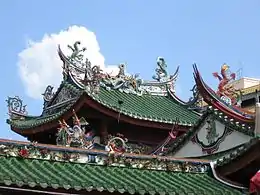 The curved roof ridges are decorated with ornate ceramic phoenixes, flowers and dragons.