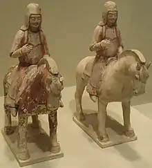 Tang dynasty tomb figures are pottery figures of people and animals made in the Tang dynasty of China (618–906) as grave goods to be placed in tombs. There was a belief that the figures represented would become available for the service of the deceased in the afterlife.[1] The figures are made of moulded earthenware with colour generally being added, though often not over the whole figure, or in naturalistic places. Where the colouring was in paint it has often not survived, but in many cases it was in sancai ("three-colour") ceramic glaze, which has generally lasted well.