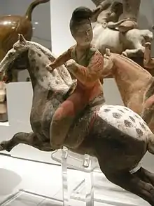 There may be groups of women as dancers or small seated orchestras of musicians, and some sitting figures appear to be beautifying themselves. More rarely, there are female riders and polo players, wearing male dress, which was usual for Tang women when riding, and apparently a fashion in the capital on other occasions.[45] The period was one of unusual freedom for well-off women in China, and the figures reflect this.[46]