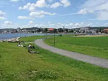 Tangen Park is a grass park in the tip of Tangen, there is a pedestrian road around the area and a playground in the middle, the area is also located with public bathrooms and bench down to the shore for fishing etc.