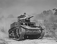 On 22 December 1941, the 192nd Tank Battalion became the first American unit to engage enemy armor in tank-to-tank combat during World War II as they ran into tanks from the Imperial Japanese Army 4th Tank Regiment.[24][25] The M3s of the 192nd Tank Battalion went up against the equally armed Type 95 Ha-Go light tank, which were armed with the 37mm cannon, but were equipped with diesel engines. The Type 95 had been at the forefront of tank technology when it was fielded in 1935.[26] Both the 192nd and the 194th Tank Battalions continued to skirmish with the 4th Tank Regiment,[27] as they retreated towards Bataan. During the remaining struggle for Bataan, the two Tank Battalions tried to defend the beaches, the airfield, and provide support for the infantry, until 8 April 1942, when the 192nd and 194th received orders to prepare to destroy their M3s. They were not entirely successful, as many of the M3 Stuarts were captured and used by the enemy during the war. When the Philippines were liberated in 1944/45, some of the captured M3 Stuart light tanks were taken back by US forces.[28] The unit withdrew to the Bataan Peninsula as part of the general retreat, and ceased to exist on 9 April 1942 when the last surviving American and Philippine forces on the Bataan Peninsula surrendered.