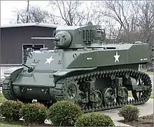 The M2 Medium Tank was a larger development of the M2 Light Tank and was first produced in 1939 by the Rock Island Arsenal, just prior to the war in Europe.[18] Many components were common or used a similar design to the Light M2, including the vertical volute spring suspension which would be used in later tanks as well. Twin-wheeled bogies were mounted externally, and rubber-bushed and rubber-shoed track proved durable on roads. The initial M2 model was powered by an air-cooled Wright R-975 radial engine. For the M2A1, this engine was supercharged to provide an extra 50 hp (37 kW) for a total of 400 horsepower (300 kW), and designated as the R-975 C1 radial engine.[19][20] The M2 Medium Tank's unique features included a total of 7 M1919 Browning machine guns, whereas most tanks only had 1 or 2, bullet deflector plates, and sloped armor on the hull front (glacis plate). The main armament was a 37 mm gun, with 32 mm armor; the M2A1 had a 51 mm gun mantlet. The features of the M2 series development, both good and bad, provided many lessons for U.S. tank designers that were later applied with great success in the M3 Lee, M4 Sherman and many other armored fighting vehicles.