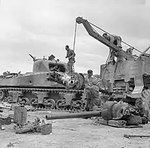 Of the 6,258 M3s produced by the U.S., 2,855 were supplied to the British Army, and about 1,368 to the Soviet Union.[37] Consequently, one of the American M3 medium tank's first actions during the war was in 1942, during the North African Campaign.[38] British Lees and Grants were in action against Rommel's forces at the disastrous Battle of Gazala on 27 May that year. They continued to serve in North Africa until the end of the campaign. A regiment of M3 Mediums was also used by the U.S. 1st Armored Division in North Africa. In the North African campaign, the M3 was generally appreciated for its mechanical reliability,[39] good armor and heavy firepower.