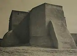 In spite of the book's title one of Adams' signature images from the book was taken at San Francisco de Asis Mission Church, which is not part of the pueblo itself but is located several miles away. He was captivated by the massive walls and buttresses of the church, saying they "seem an outcropping of the earth rather than merely an object constructed upon it."[4] At the same time, the church was an embodiment of the ongoing cultural conflicts in the area between the Indian and Hispanic cultures; it was a Catholic church built in Indian style and represented how the Taos Indians' survival was achieved in part through cultural adaptation by necessity.