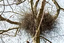 Witches broom on birch trees (Betula species), are dense bunches of stunted twigs which look like birds nests. The gall starts as densely packed clusters of buds which can remain for many years. Possibly, when the fungus loses vigour, the buds grow into many slender shoots. In the spring, asci form on small leaves which grow on the shoots. These leaves usually fall before the normal leaves grow elsewhere on the tree.[3] There can be several witches broom in a tree.[4] Witches broom, formed by Taphrina betulina can be found on dwarf birch (Betula nana), Betula nana x pubescens, silver birch (Betula pendula), downy birch (Betula pubescens) and Betula pubescens var.glabrata.[1] A phytoplasma can also form similar looking witches broom on birch.[4]
