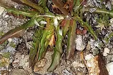 The leaves of Taraxacum ceratophorum are primarily basal, with a patent or erect orientation. They are alternate in arrangement and die annually. Petioles may or may not be present, ranging from 0 to 40 (or occasionally up to 70) mm in length. These petioles can be winged, either broadly or narrowly, and are typically glabrous. The leaf blades of this species are simple in structure, with attenuate bases. They measure 50 to 120 mm in length and 7 to 30 mm in width, displaying an oblanceolate shape. The blades are flat and appear to have a single vein or pinnate veins. The adaxial surface of the blade is glabrous, as is the abaxial surface. The blades can be broadly or narrowly lobed, with runcinate and dentate margins. The degree of incision can range from 5% to 95%, and the apices of the lobes are acute. The blade margins may exhibit between 1 and 8 (or occasionally up to 11) teeth on each side, counting both the dentations and tips of the runcinate lobes. These teeth are located toward the apex of the blade.[3]