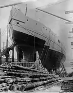 Tarmo was powered by two triple-expansion steam engines manufactured in Wallsend, one driving a propeller in the stern and the other a second propeller in the bow.[2] The main function of the bow propeller was to reduce friction between the hull and the ice although the exact details of the icebreaking process were not known at that time.[30] The stern engine produced 1,700 ihp at 97 rpm and the bow engine 1,300 ihp at 107 rpm, but for short periods of time they could put out 2,400 ihp at 98 rpm and 1,450 ihp at 120 rpm, respectively. This made her considerably more powerful than Sampo, whose two engines had together produced only 3,052 ihp during sea trials and were rated at 2,800 ihp. Tarmo could maintain a speed of 13 knots (24 km/h; 15 mph) in open water, typical for icebreakers of her type at that time.[31] Like all icebreakers of her age, Tarmo was also equipped with sails – two staysails and two Bermuda sails – although they were rarely, if ever, used. In the early 1930s, the sails were cut up piece by piece for other uses and eventually disappeared from the inventory.[2]