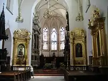 It is a Gothic church, rebuilt in later periods. The building has three naves with an elongated chancel and west tower added that one rises 72 meters.