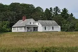 The Tarr–Eaton House stands in Harpswell Center, on the west side of Harpswell Neck Road (Maine State Route 123), in a field just north of the 1750 Harpswell Meetinghouse, a National Historic Landmark. It is a single-story wood frame structure, with a side gable roof, a large central chimney, five-bay facade, clapboarded exterior, and a foundation of concrete and rubblestone. A single-story shed-roof ell extends northward from its rear northeast corner. The main facade faces south, consisting of four windows with simple surrounds, two on either side of the main entrance, which is topped by a four-light transom window. A porch extends across the eastern facade, supported by simple square posts. The interior has a typical center-chimney plan, with the entry vestibule housing a narrow winding staircase, with parlor spaces to either side, and the kitchen behind. Fireplaces feature Federal period mantels, and the interior retains other period finishes.[2]