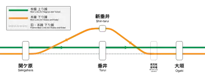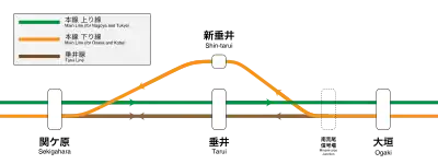 From 1944 to 1986 there was Shin-Tarui Station (新垂井駅, Shin-Tarui eki) on the westbound main line from Ogaki to Sekigahara. It was about 3 km far from Tarui Station and only westbound local trains stopped at the station. It had 1 through track and 1 siding track with a side platform. 35°23′30″N 136°30′47″E / 35.391542°N 136.512931°E / 35.391542; 136.512931