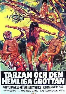 Steve Sipek also known as Steve Hawkes[3] gained recognition by playing Tarzan in two Spanish/Italian produced films. Tarzán en la gruta del oro/King of the Jungle/Tarzan in the Golden Grotto (1968) that was filmed in Suriname, South America, Florida, Africa, Spain and Italy where the producers ran out of money and had to begin filming again. Unlike his first "Tarzan" film, Sipek claimed the film company paid the huge licensing fees from Edgar Rice Burroughs' estate and were able to use the name "Tarzan"[4] for the character.[5]