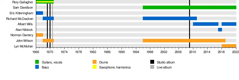 In 1996, Richard McCracken and John Wilson reformed the band with guitarist/vocalist Sam Davidson taking over Rory Gallagher's role as frontman, with Albert Mills replacing McCracken in 2010.[5] The band continued in this formation until February 2017, when it was revealed that the band would tour under the name "Little Taste of Rory feat. John Wilson", and that the line-up now consisted of Wilson, Davidson, and new bassist Alan Niblock.[6] In 2018 John Wilson retired from the band due to ill health but Sam Davidson continues to perform as "Sam Davidson's TASTE" with Albert Mills back on bass and Lyn McMullan taking over from Wilson on drums.